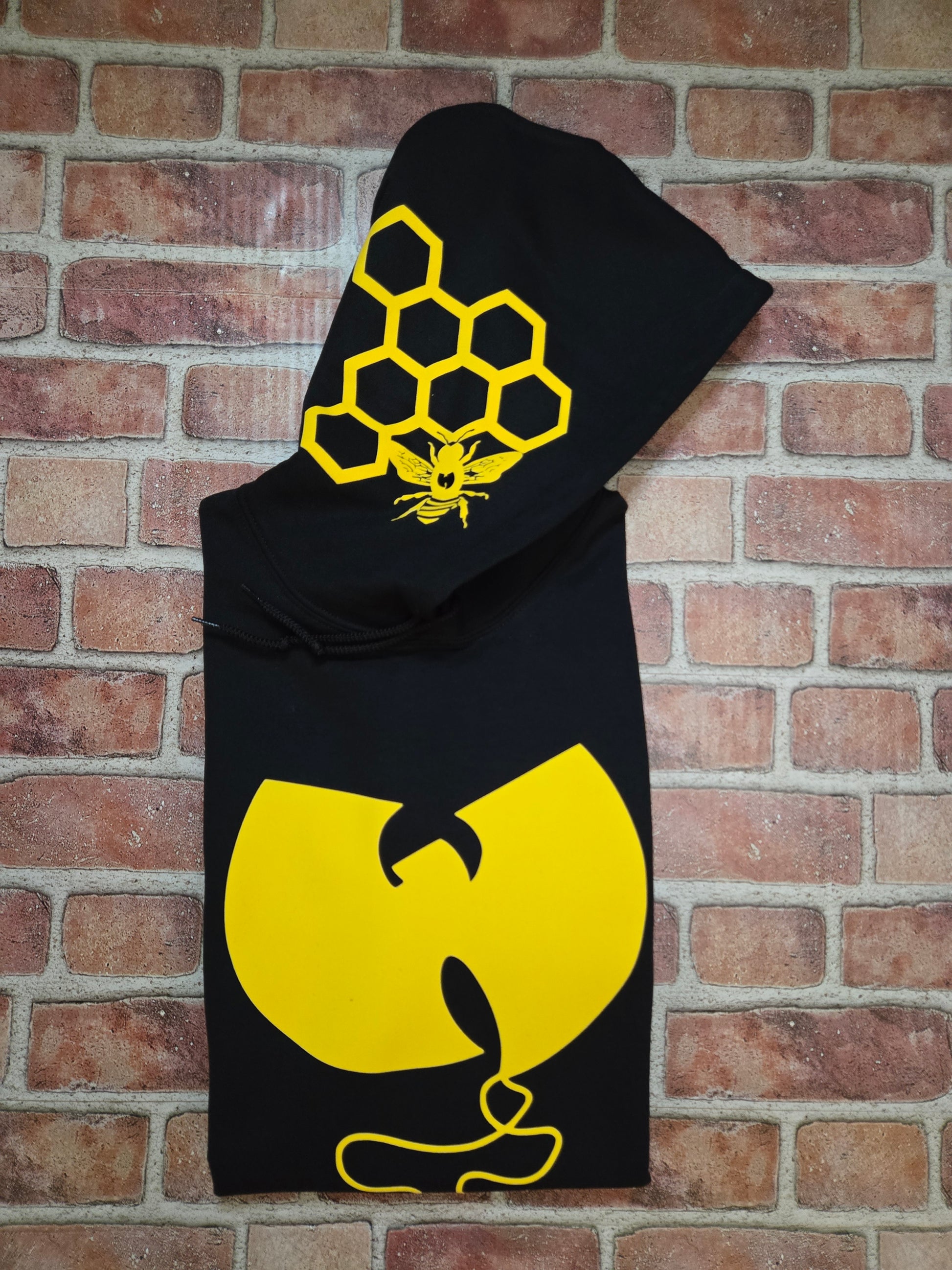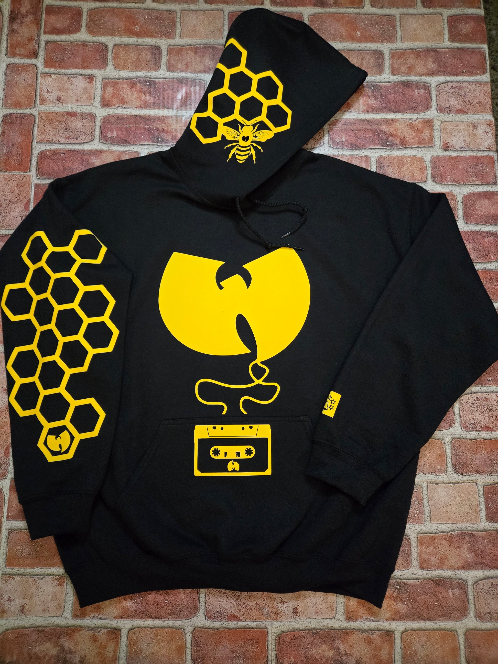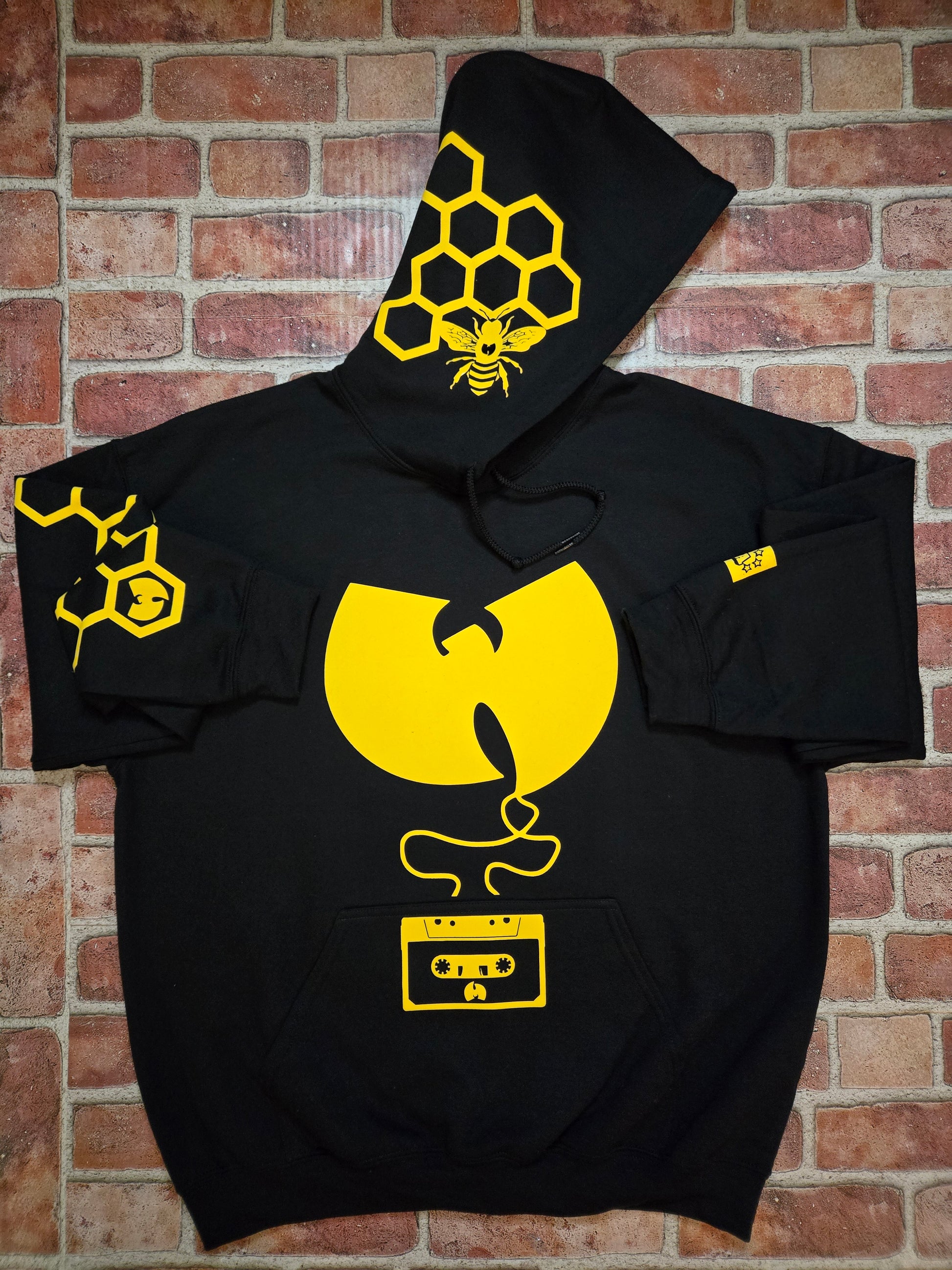 The Pollen hoodie is stung with purpose — a killer bee statement stitched in heavyweight black. Flock graphics hit the chest with a bold emblem and cassette tape flip, a nod to raw mixtape days when culture spread hand to hand. Honeycomb grids climb the sleeve and hood.