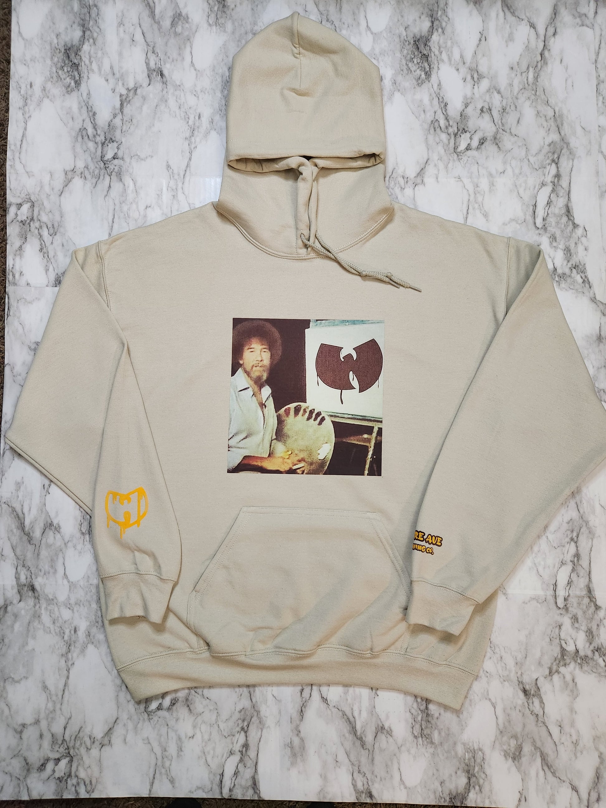 The WuRoss hoodie trades happy little trees for heavy bars. A art inspired print hits the front with a distorted, vintage look, flipping serenity into something sharper, louder, and built to last. Finished with a flock “W” accent on the sleeve, this hoodie balances canvas calm with cipher energy — art and grit stitched into one.