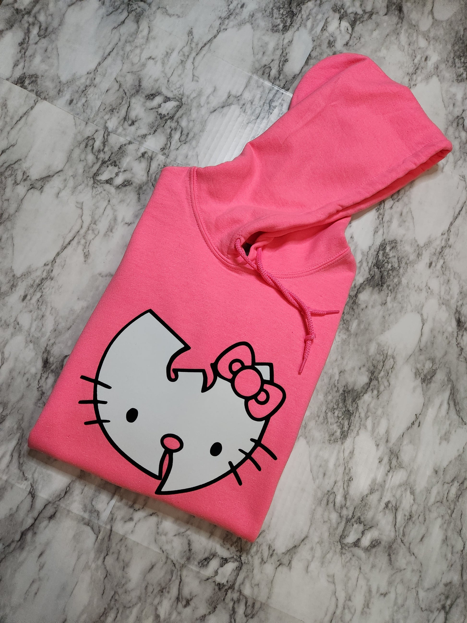 The Hello Wu hoodie plays with innocence but flips it on its head. A bright pink backdrop sets the stage for a flocked face that’s equal parts cute and cutthroat — soft curves spiked with sharp edges. Down the sleeve, the Hello Wu tag turns a greeting into a statement, marking this piece as both parody and proclamation.