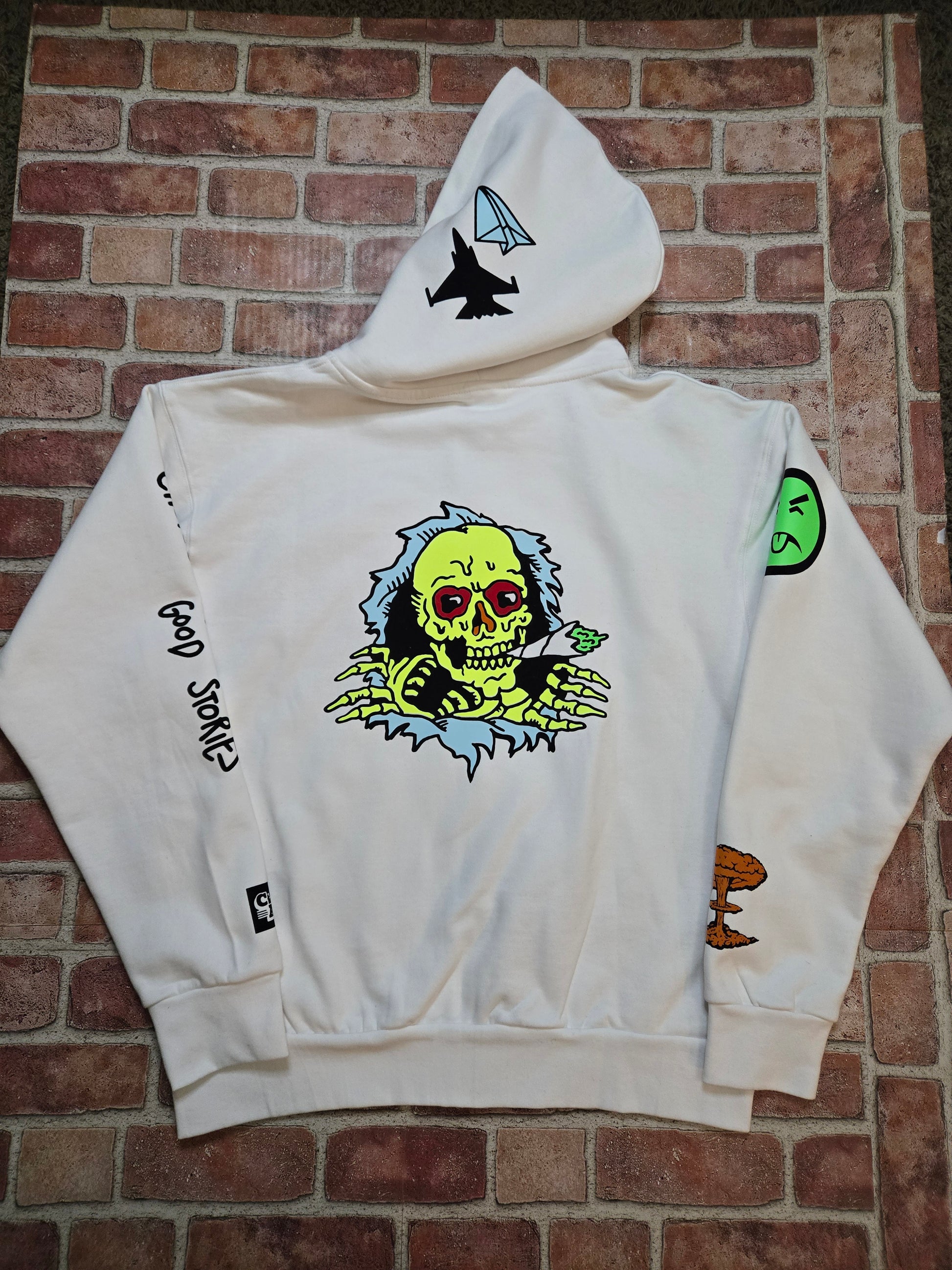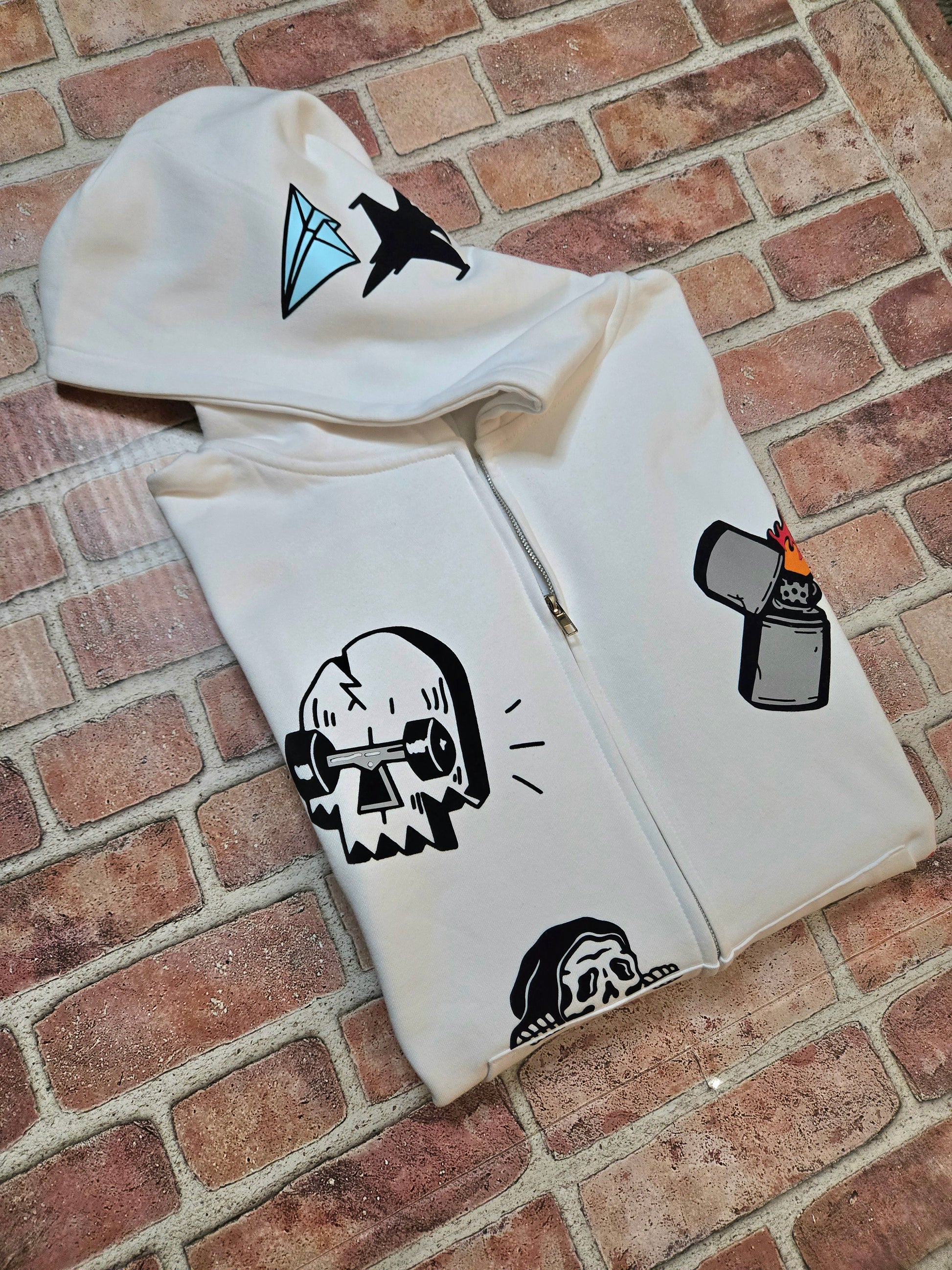 Front and back, it’s chaos stitched with purpose — skeletons breaking through, fallout clouds, burning lighters, and the reminder that bad choices make good stories. Every graphic is a nod to skate culture’s grit and glory — the wipeouts, the late nights, the legends written in concrete. The zip-up cut makes it versatile, the weight makes it durable, and the details make it untouchable. This isn’t just a hoodie — it’s a piece of the Ave.